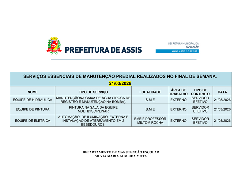 A Secretaria Municipal da Educação de Assis informa que, ao longo deste fim de semana, serão realizados trabalhos essenciais de manutenção predial em diversas unidades escolares da rede municipal.